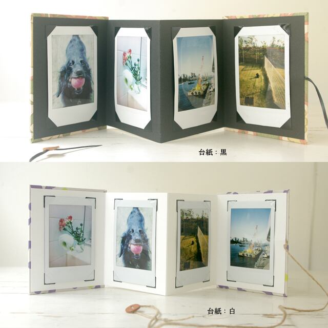 チェキ(instax mini:フィルムサイズ:86×54mm)が4枚飾れるアコーディオンアルバムです。
